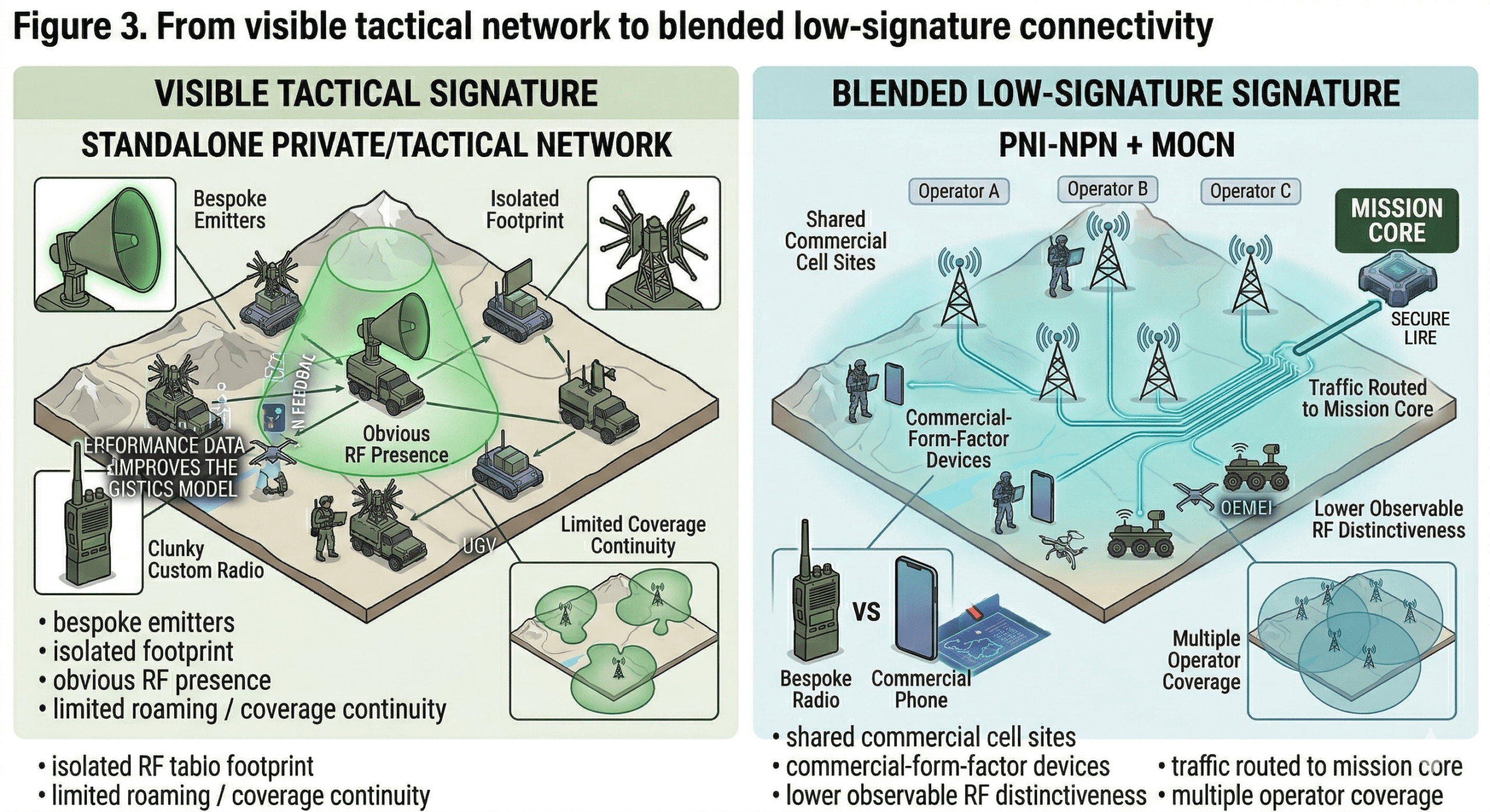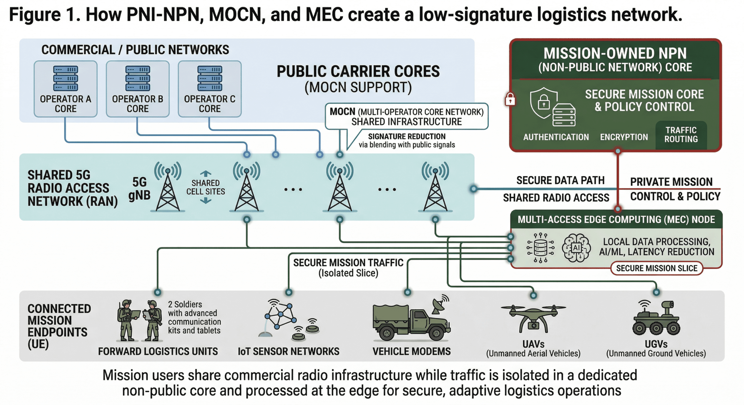 The convergence of PNI-NPN, MOCN, and MEC creates a new design space for contested logistics. It allows sustainment networks to operate within commercial environments, utilize commercial infrastructure, support autonomous platforms, and still maintain mission control, encryption, policy, and survivability.