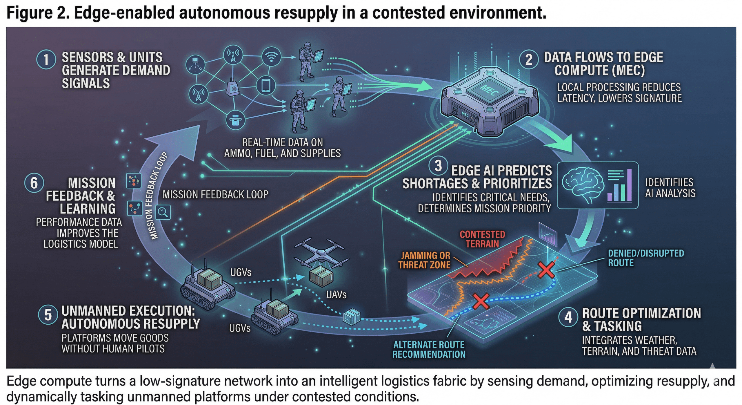 Contested logistics cannot rely on fixed depots, predictable routes, or constant reachback. Decisions must be made near the point of need. MEC places computing at the edge at forward hubs, aboard ships, inside hardened shelters, or on transportable nodes so logistics decisions occur where the data is generated and where time is most critical.